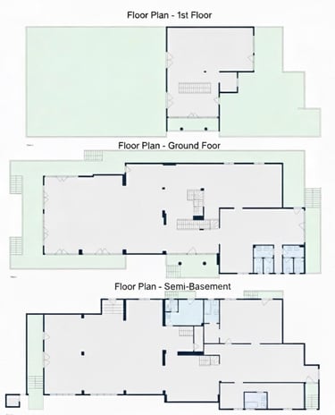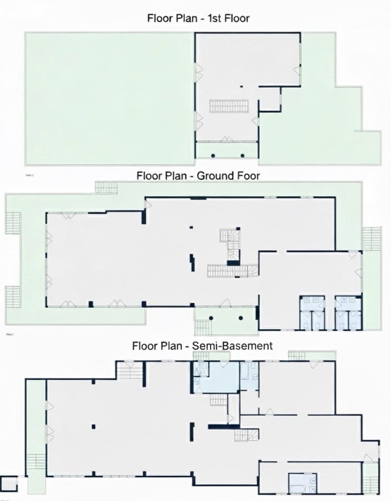 Ground Floor: Expansive central hall with high ceilings — ideal for reception, restaurant, retail, or event space. Multiple service rooms and restrooms, direct access to both front and rear courtyards.